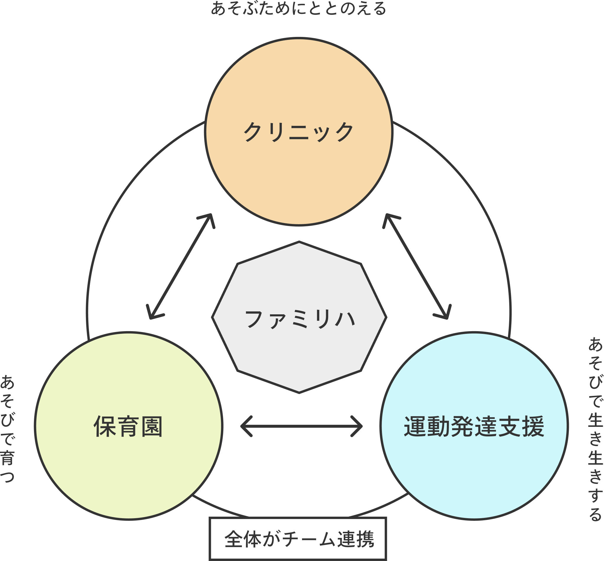 運動発達に関する医学的知見を基盤に、日常の中で自然と力が引き出される場をデザインし、地域に持続的な豊かさを育んでいきます。地域のみなさまが身体も心も健やかに過ごせる、あたたかな環境をつくることを目指しています。